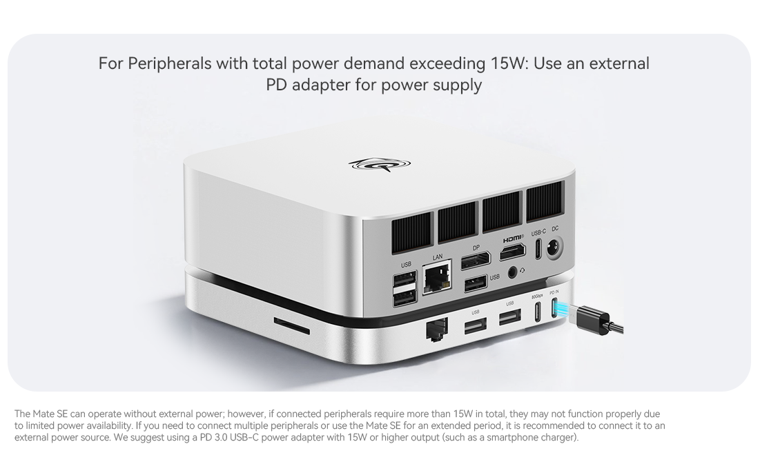 Für Peripheriegeräte mit einem Gesamtleistungsbedarf von mehr als 15 W: Verwenden Sie einen externen PD-Adapter zur Stromversorgung