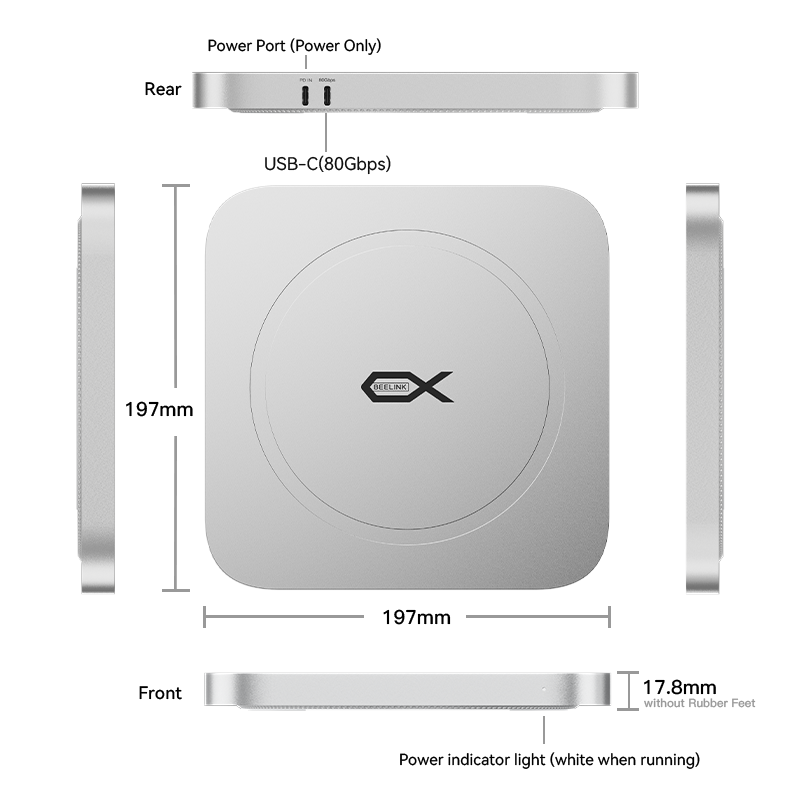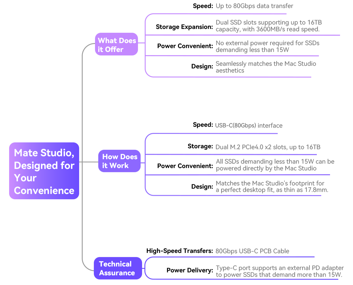 *Das Mate Studio kann ohne externe Stromquelle betrieben werden. Allerdings bei Verwendung von SSDs, die insgesamt mehr als 15 W verbrauchen. Eine unzureichende Leistung kann zu Instabilität führen. Für eine optimale Leistung empfehlen wir die Verwendung eines PD 3.0 Typ-C-Netzteils (15 W oder höher), z. B. eines Standard-Telefonladegeräts.