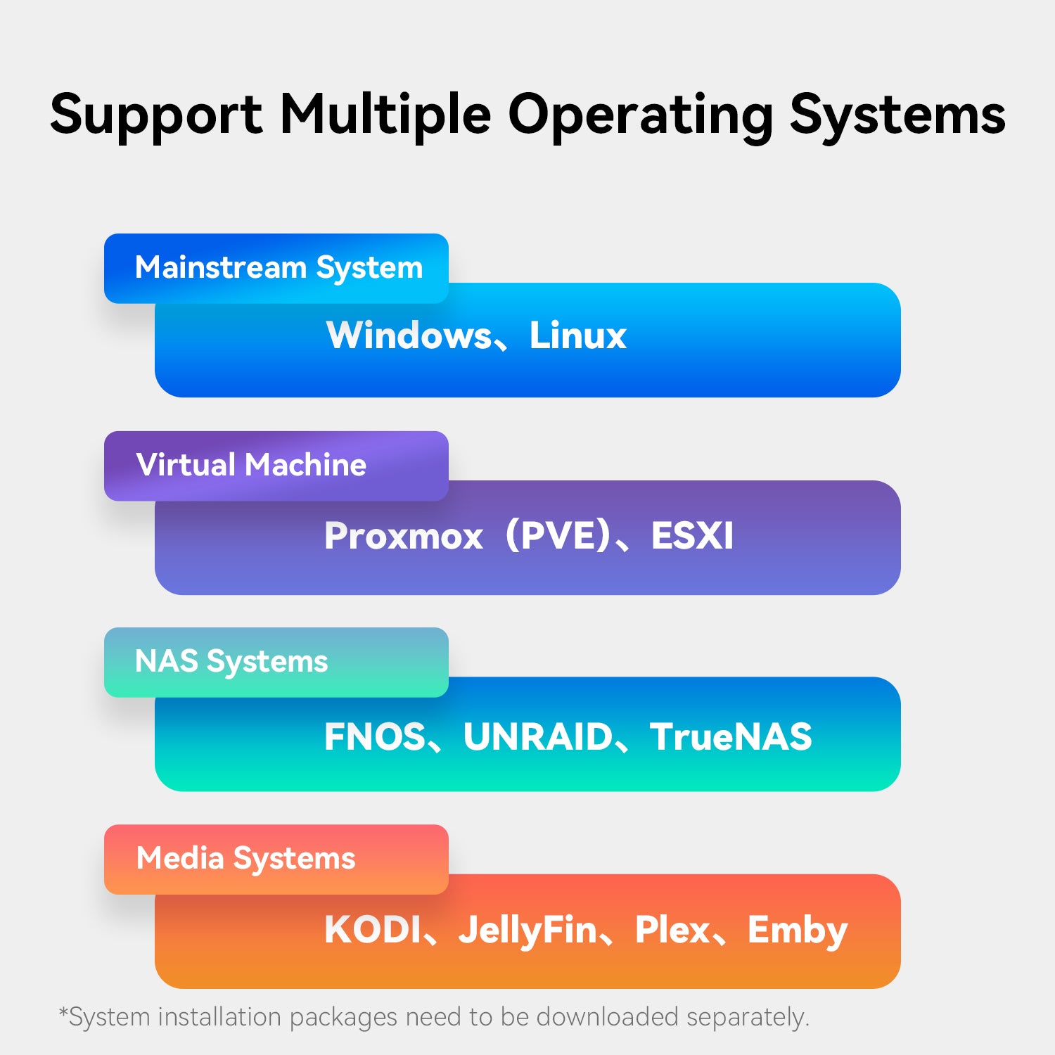Es wird empfohlen, leichtgewichtige Systeme (NAS, Softrouter) auf eMMC zu installieren, um SSD-Speicher zu sparen. Für eine optimale Leistung verwenden Sie für die Systeminstallation die SSD in Steckplatz Nr. 4.