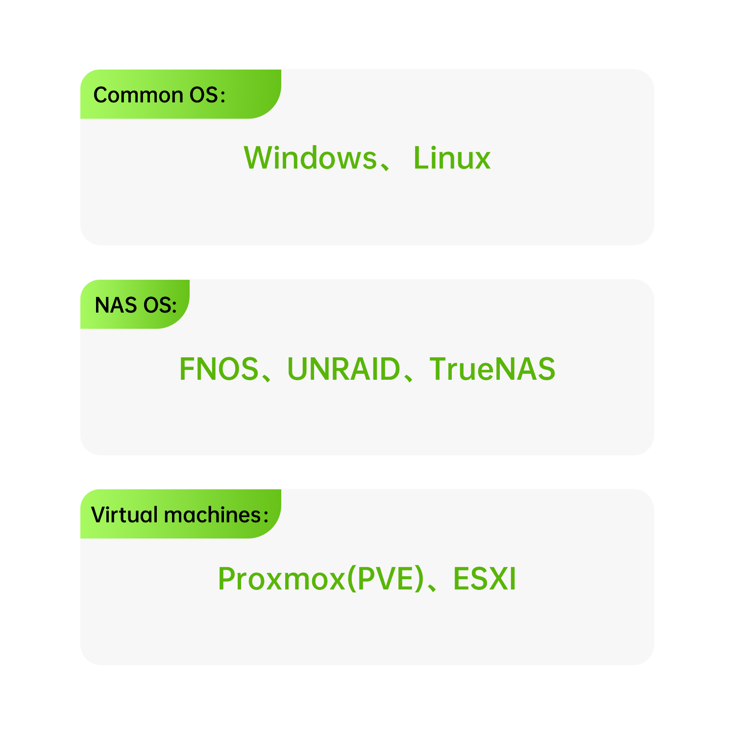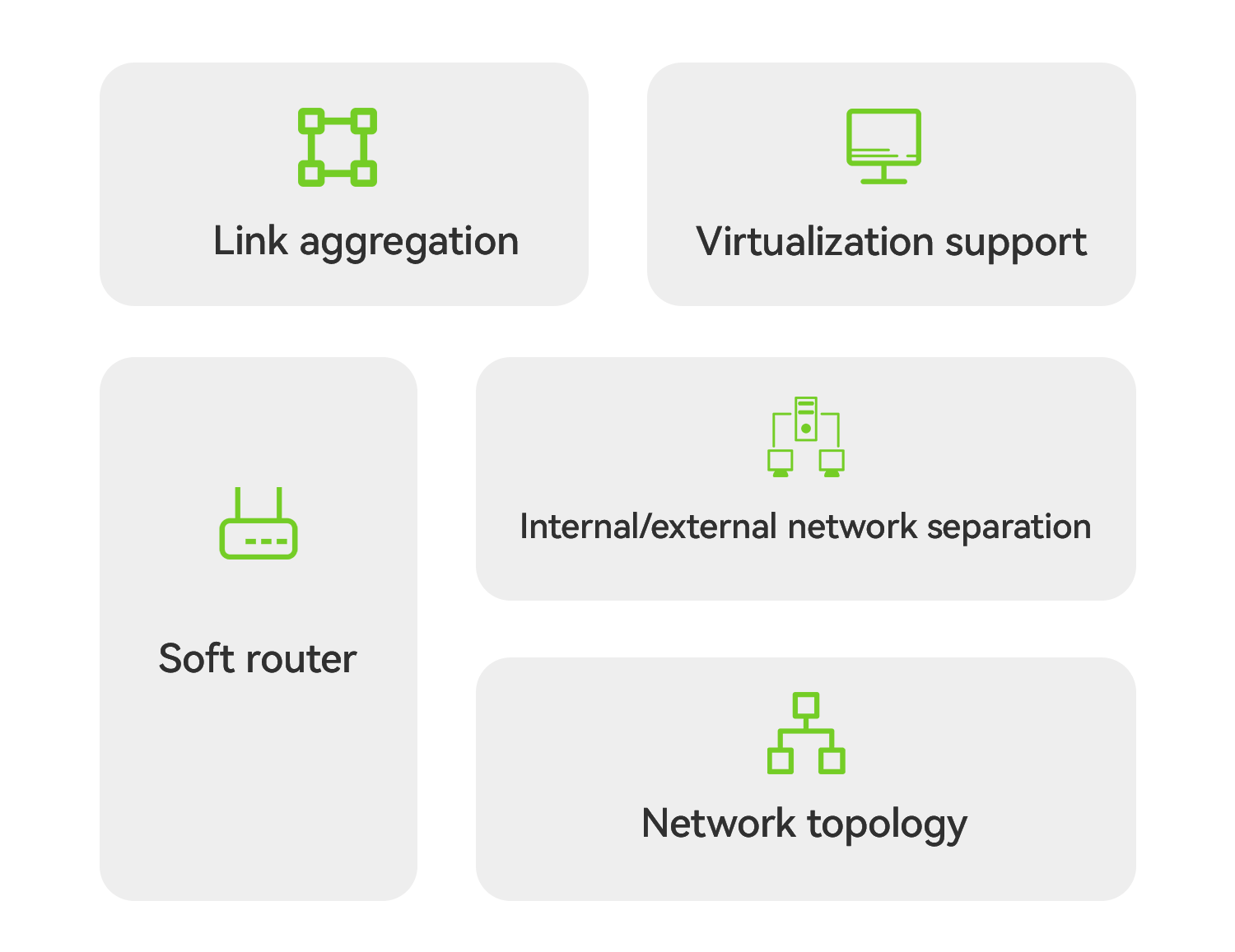 It supports multiple network modes such as link aggregation, virtualization, and software routing, and is suitable for home, office, and lightweight server scenarios, matching the optimal networking solution as needed.