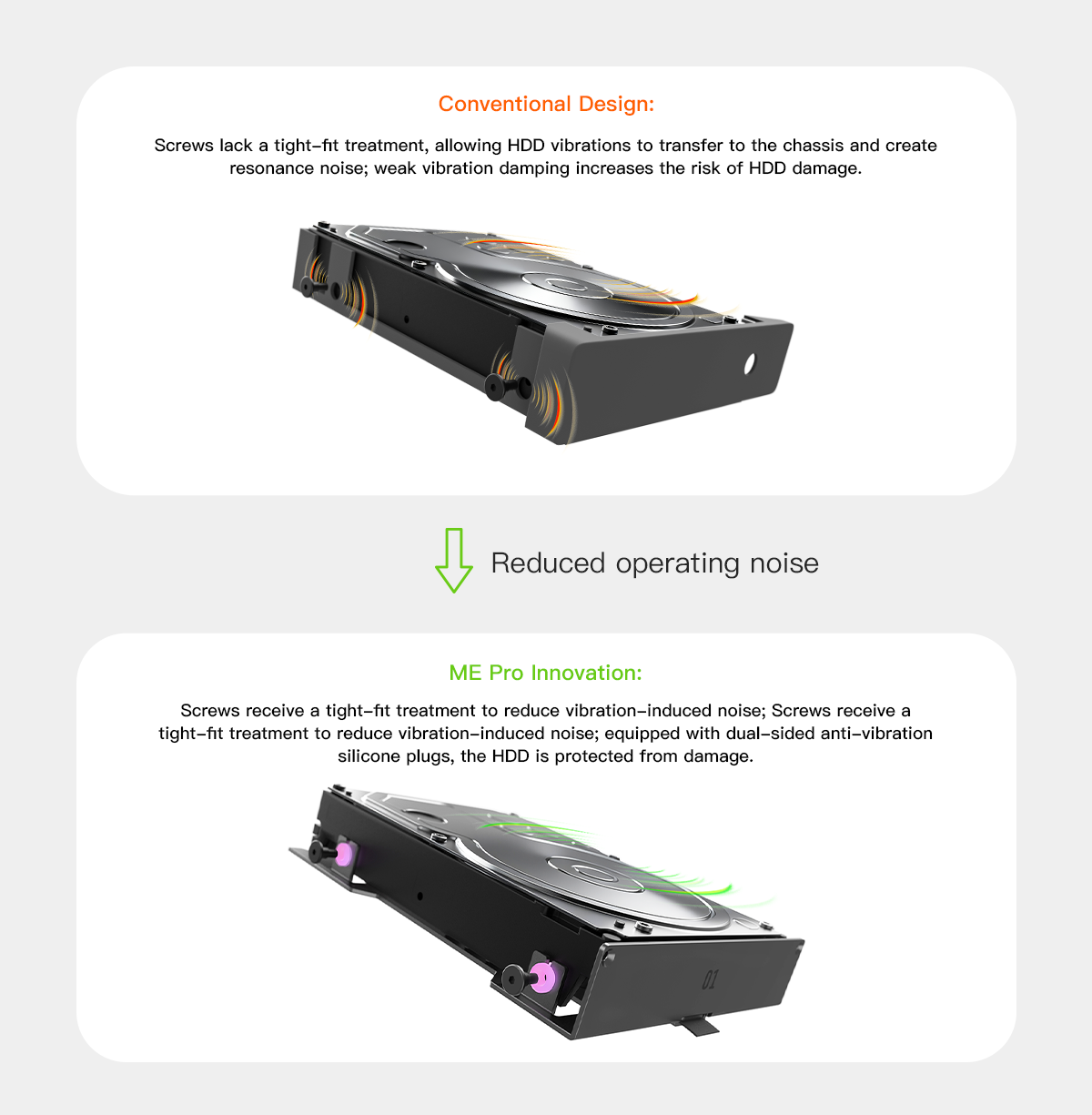 Conventional designs, due to the lack of screw tightening, are prone to causing hard drive vibration to resonate and damage the hard drive; ME Pro innovatively upgrades the screw tightening process and adds double-sided anti-vibration silicone plugs, providing dual protection for noise reduction and drive protection.