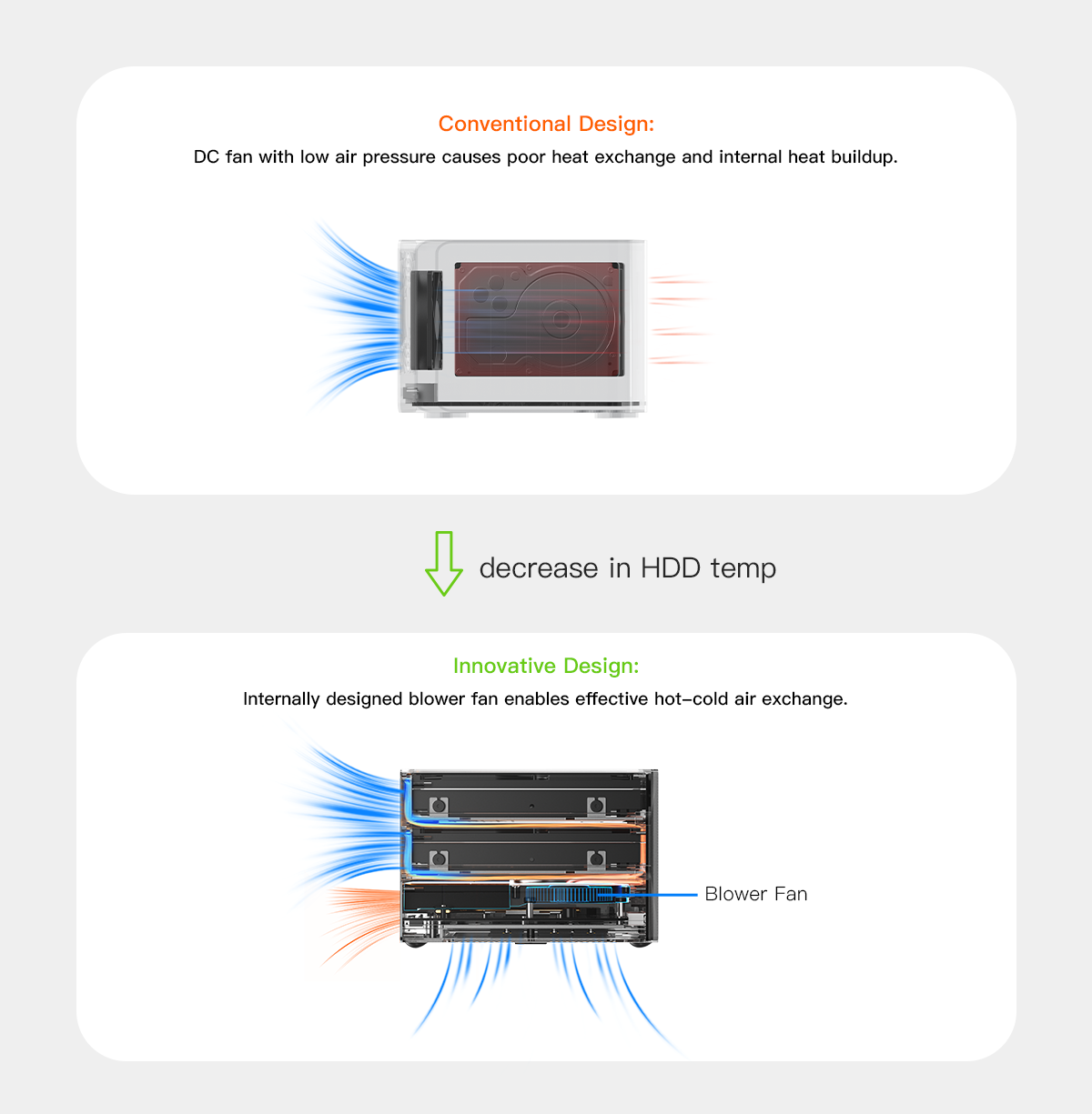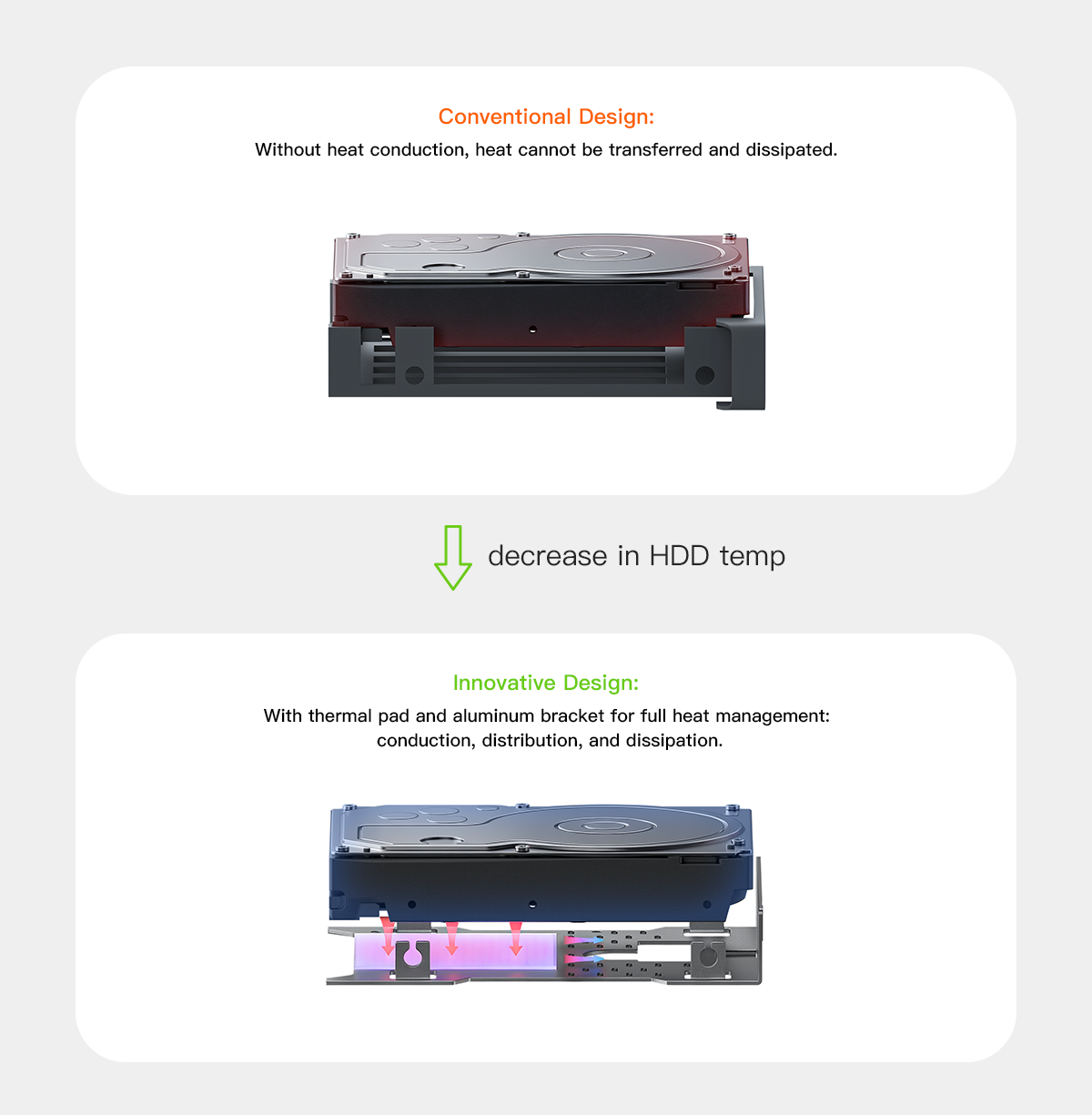 While conventional designs lack dedicated thermal conduction components and thus cannot deliver the full trio of critical heat processing functions (heat conduction, spreading, and dissipation), the ME Pro’s innovative integration of thermal pads and aluminum brackets enables a complete, three-stage thermal management system that reduce temperature and extend hard drive lifespan.