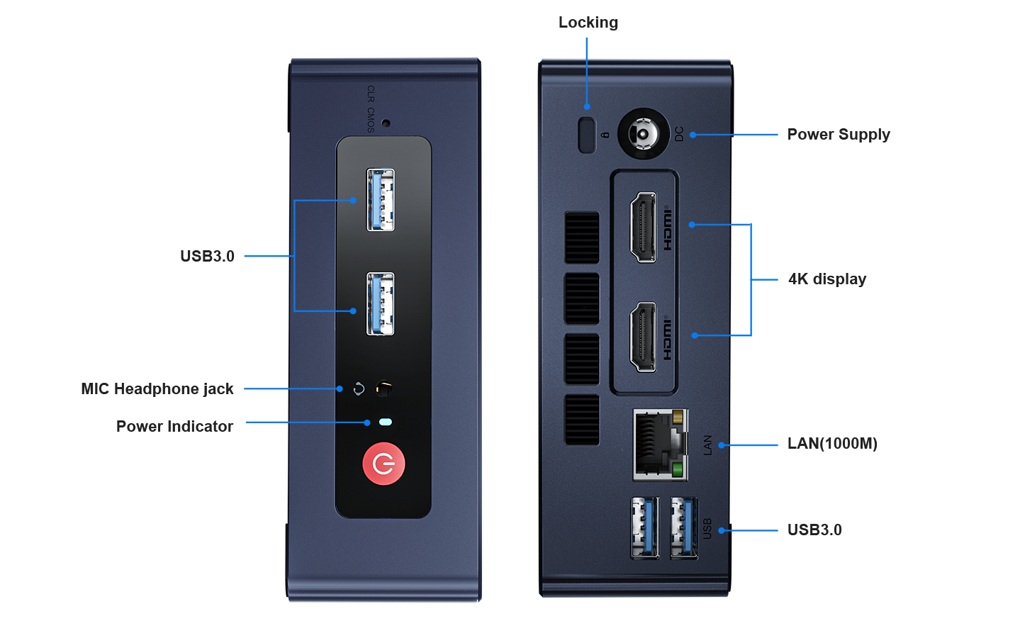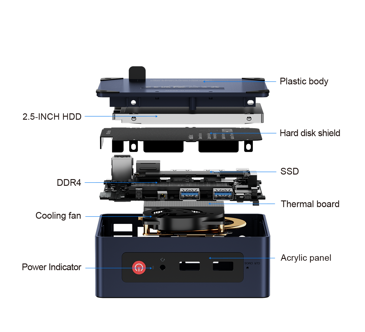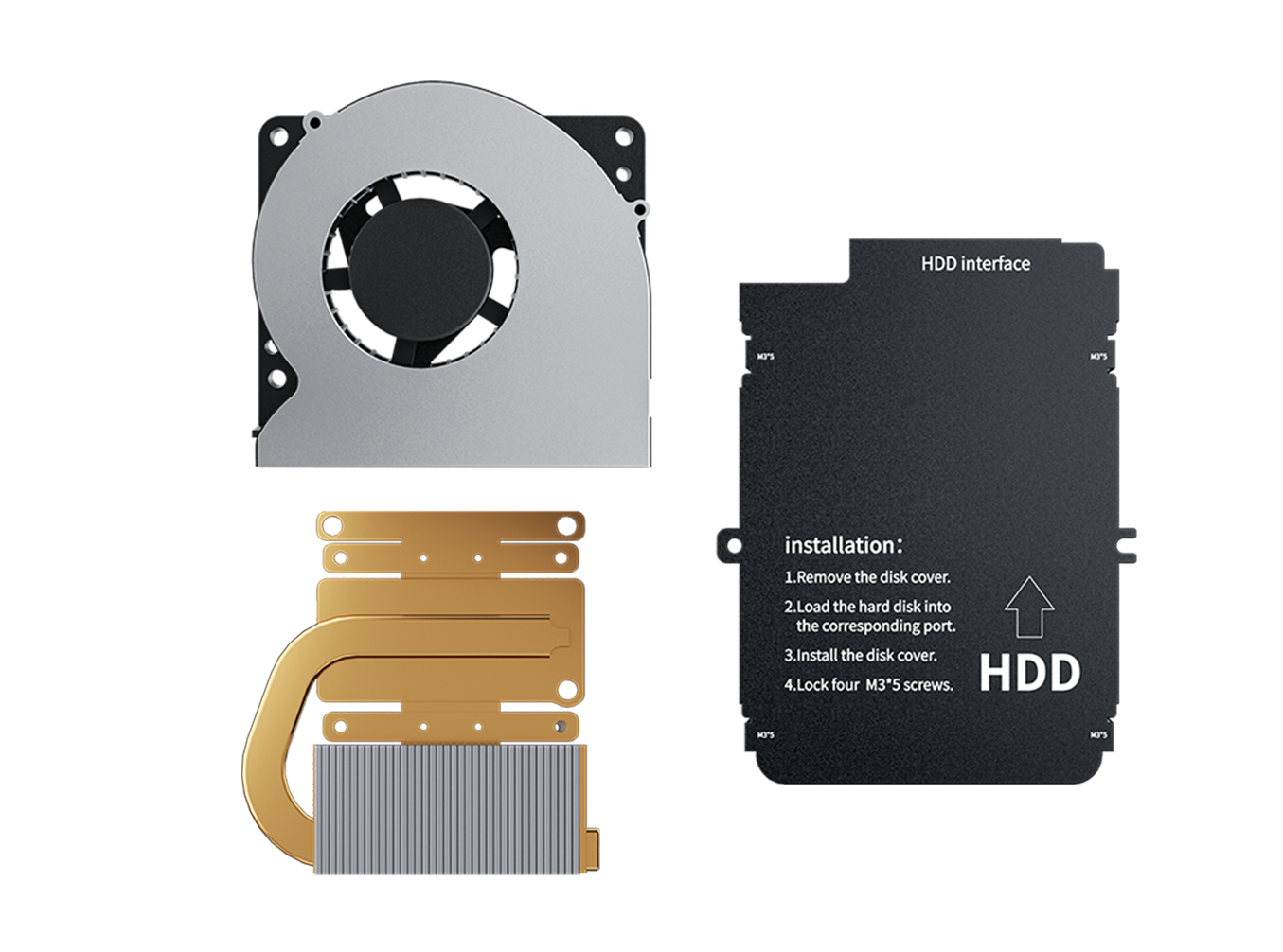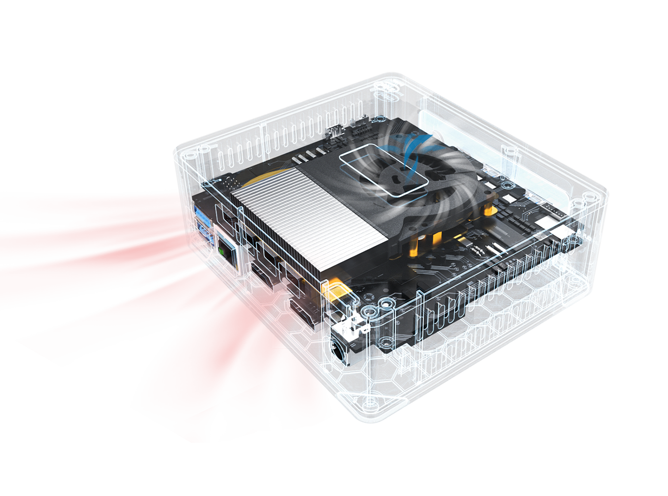 Lüfter + Kühlkörper + Festplattenkühler arbeiten zusammen, um maximale Kühlung für den Mini-PC zu bieten, indem sie die trockene Wärme von seinem Gehäuse ableiten und die Temperatur seiner CPU während des Betriebs senken.