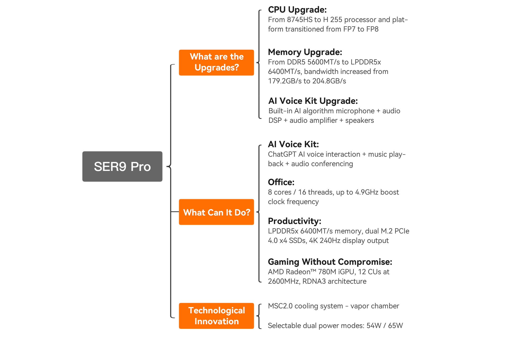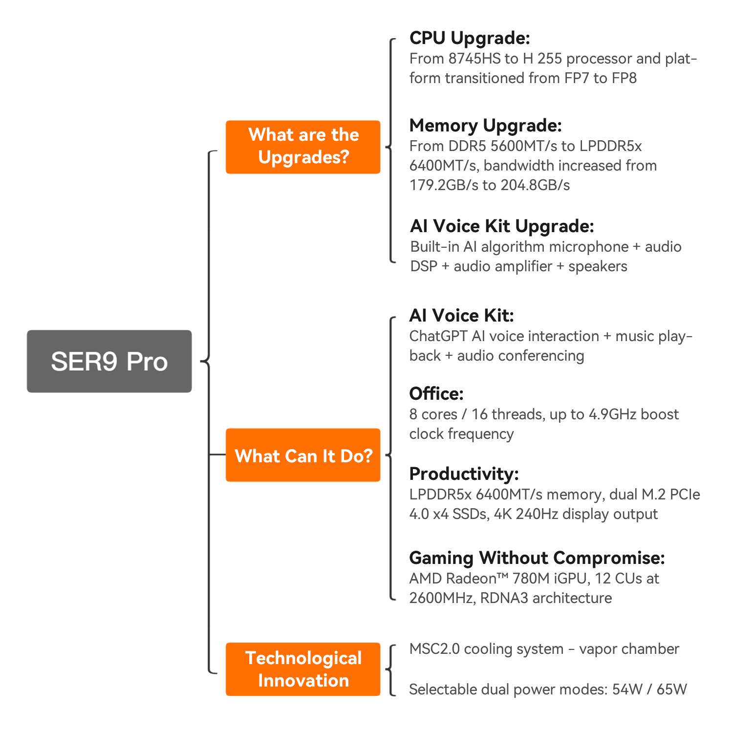 Das Al-Voice-Kit enthält ein Al-Algorithmus-Mikrofon + Audio-DSP + Audioverstärker + Lautsprecher. *Hinweise: SER9: Kein Lautsprecher/Mikrofon; SER9 Pro: Mit Lautsprecher & Mikrofon