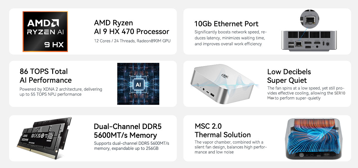 New AMD Ryzen Al 9 HX470 | 86 TOPS Total AI Performance | Dual-Channel DDR5 5600MT/s Memory | Low Decibels, Super Quiet | 10Gb Ethernet Port | MSC 2.0 Thermal Solution