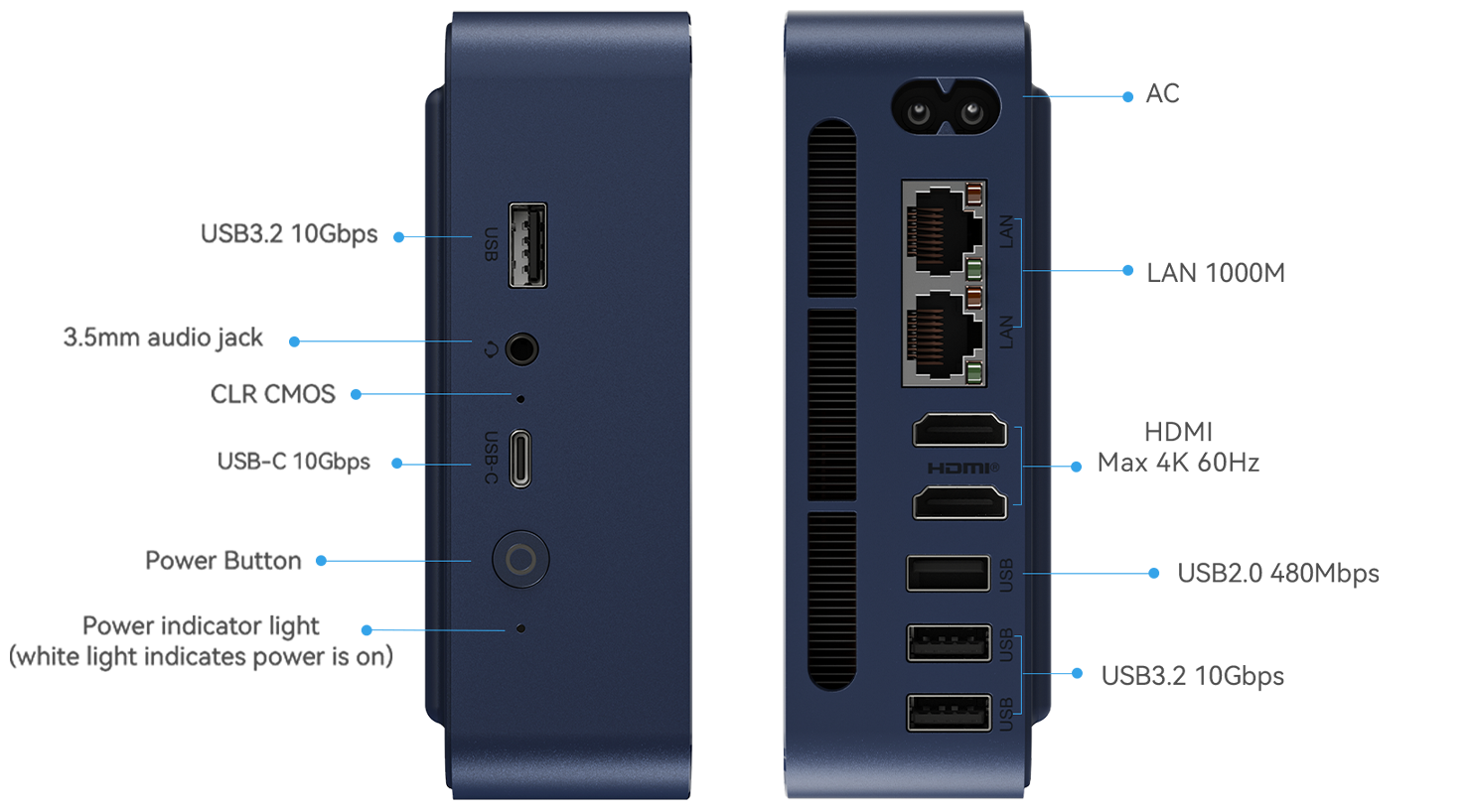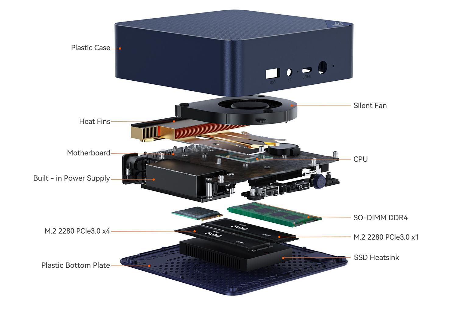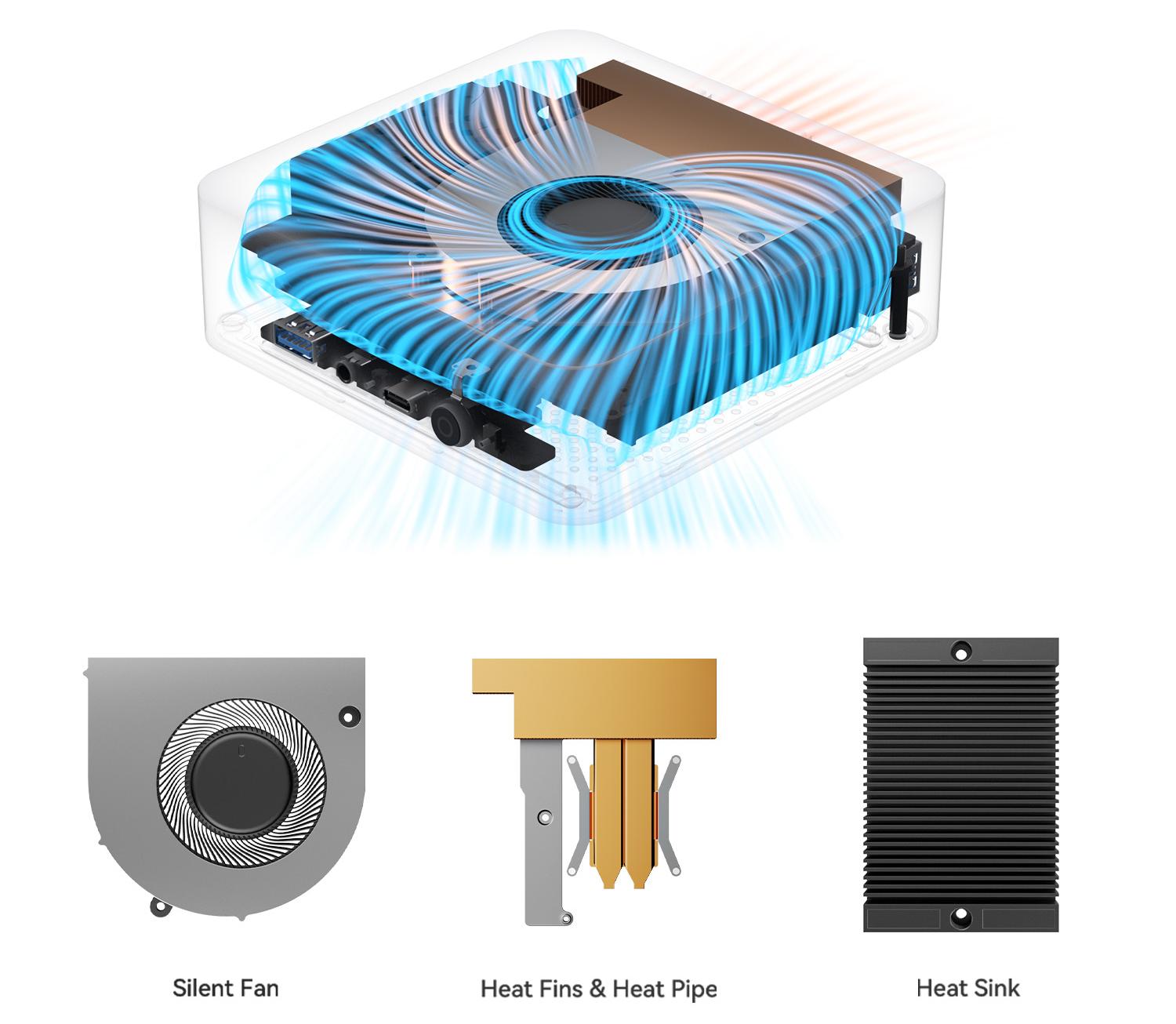 Air intake from the bottom is so efficient at dissipating the heat that EQ14 needs very low fan speed to stay cool and stable, ensuring near-silent operation. Since there are no vents on the top and side panels, the mini PC can now have a more refreshing design.