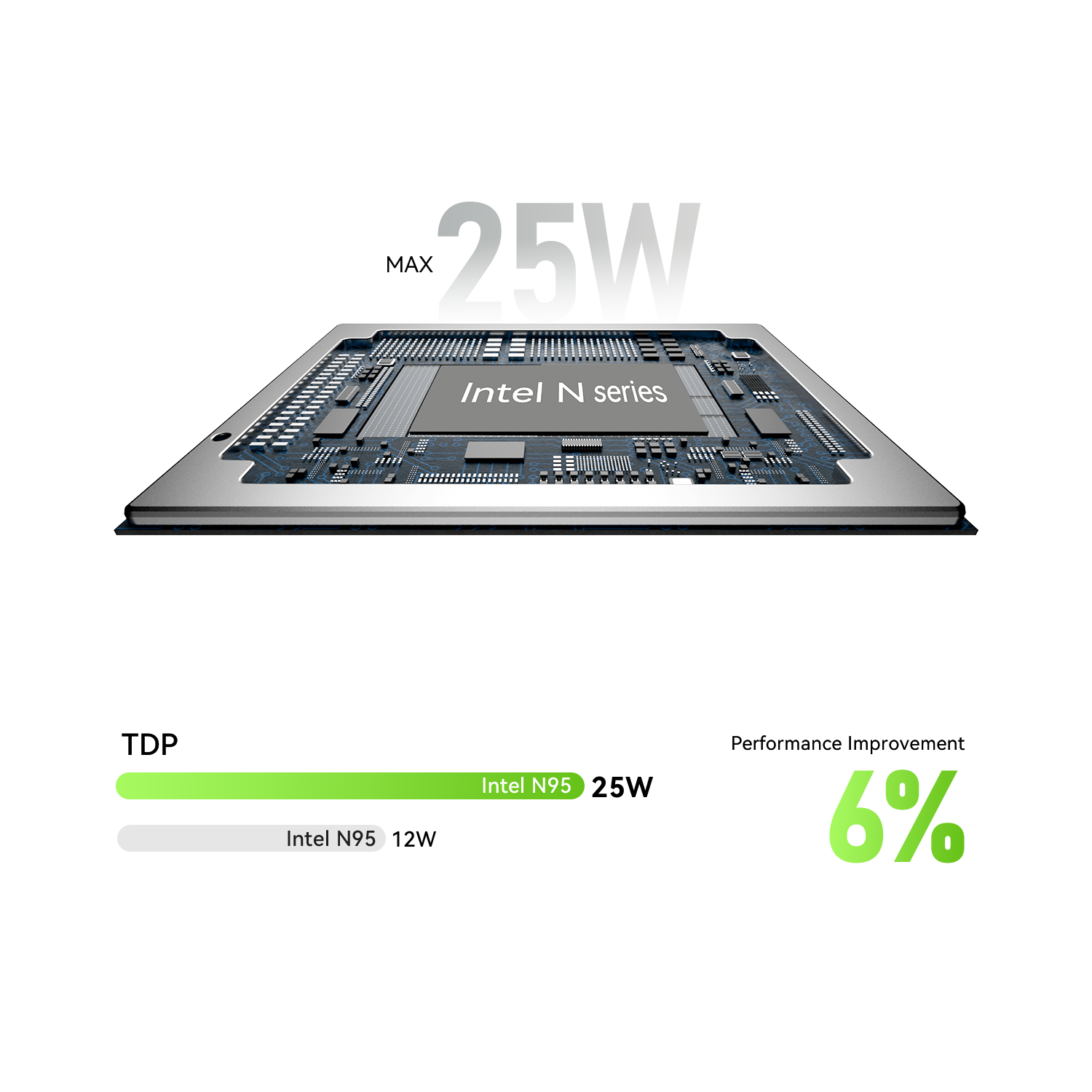 Equipped with an Intel N95/N150 quad-core processor, with a maximum turbo frequency of 3.4/3.6GHz, and a 6% performance improvement compared to the 12W version at full 25W TDP. Supports multiple codec formats such as AVC, MPEG2, MJPEG, HEVC, and VP9, adapting to diverse audio and video processing needs.