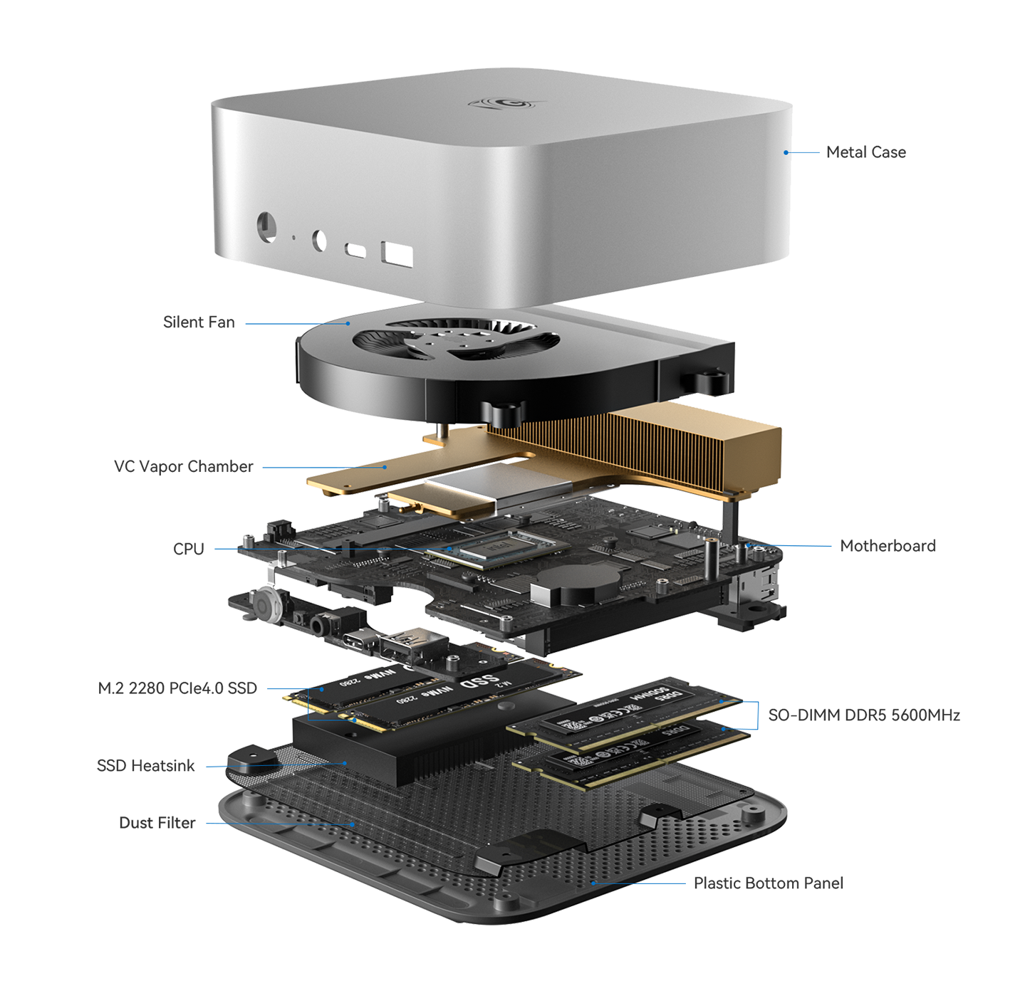 The system fan and heat sink dissipate the heat through airflow, offering efficient cooling for the CPU、SSD and RAM.