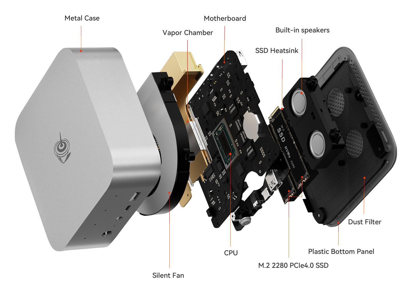 Air intake from the bottom is so efficient at dissipating the heat that SER9 Pro needs very low fan speed to stay cool and stable at 65W TDP, ensuring near-silent operation. Since there are no vents on the top and side panels, the SER9 Pro can now have a more refreshing design.