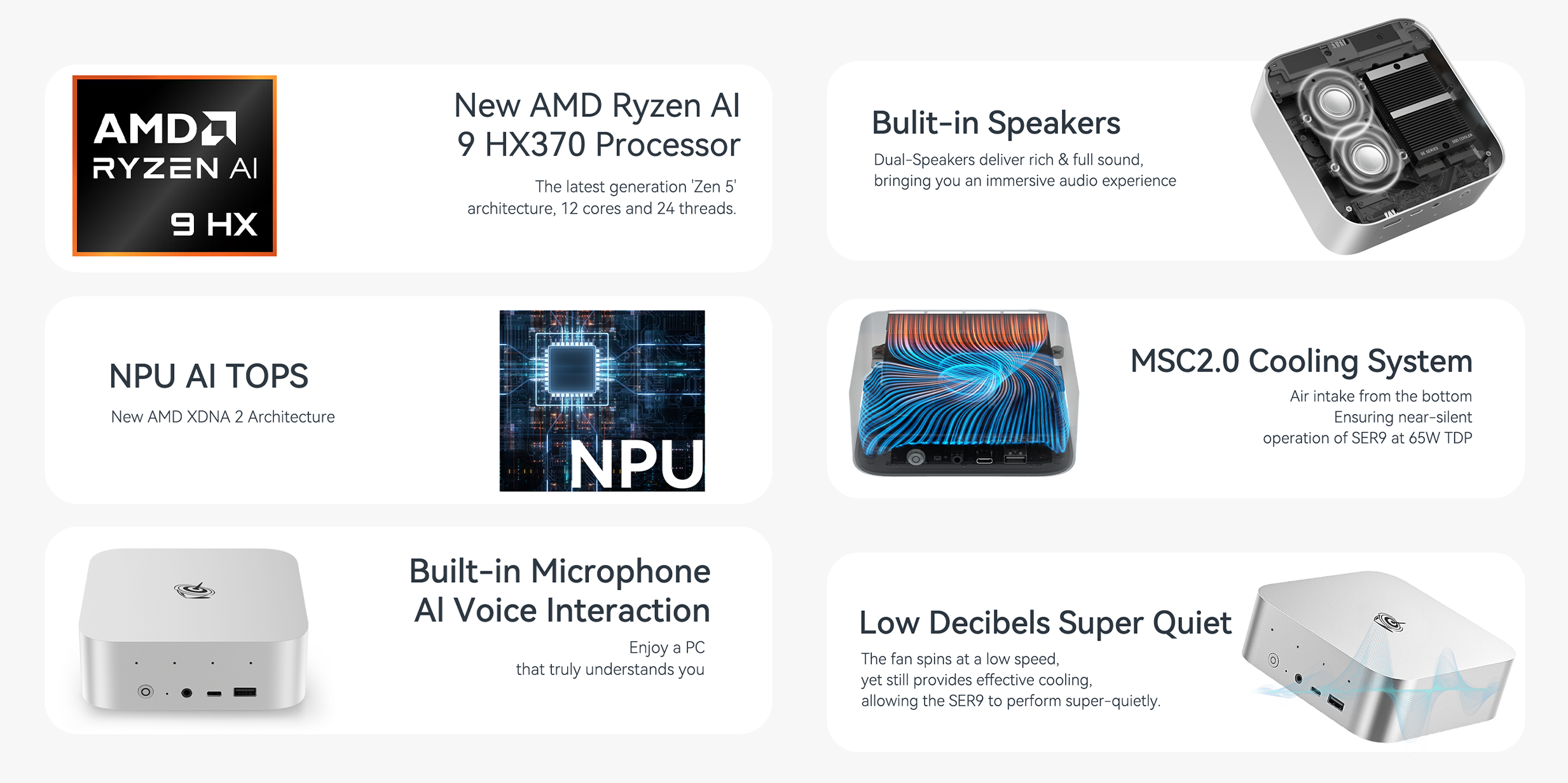 New AMD Ryzen Al 9 HX370 | NPU AI TOPS | Built-in Microphone Al Voice Interaction | Bulit-in Speakers | MSC2.0 Cooling System | Low Decibels Super Quiet